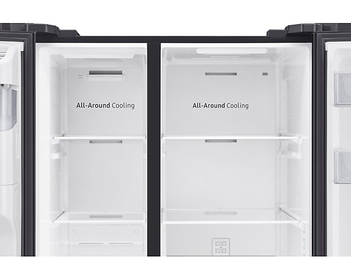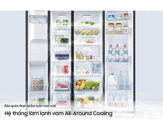Với công nghệ All-Around Cooling, tủ lạnh Samsung RS64R53012C/SV tạo luồng khí lạnh đồng đều khắp các ngăn, giúp duy trì nhiệt độ và độ ẩm ổn định. Điều này giúp thực phẩm luôn tươi ngon lâu hơn mà không bị đóng băng cục bộ.