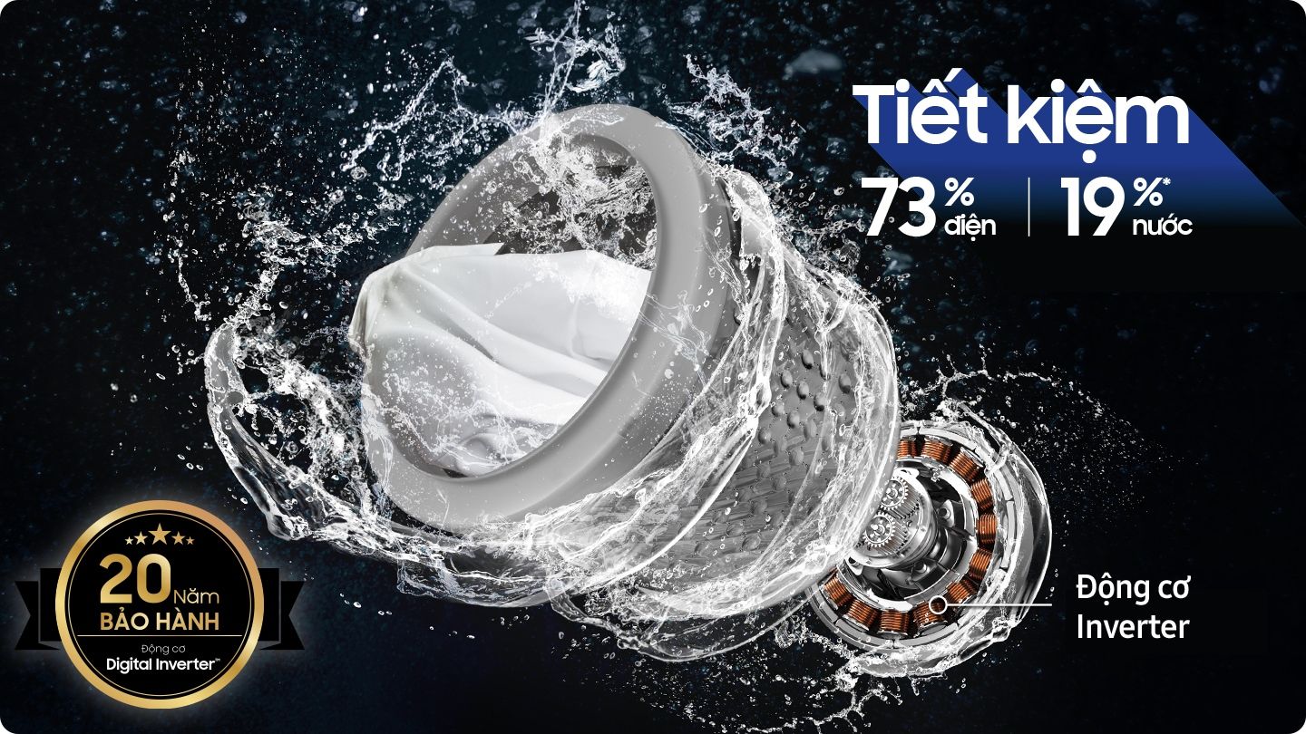 Máy Giặt 9.5 kg Ecobubble™ Máy logic Cửa Trên - Động Cơ Digital Biến tần được trang bị động cơ Digital Biến tần – công nghệ tiên tiến giúp tối ưu hóa chuyển động lồng Rửa, giảm ma sát, từ đó hoạt động tối hơn và tiết kiệm năng lượng lên đến 40%.